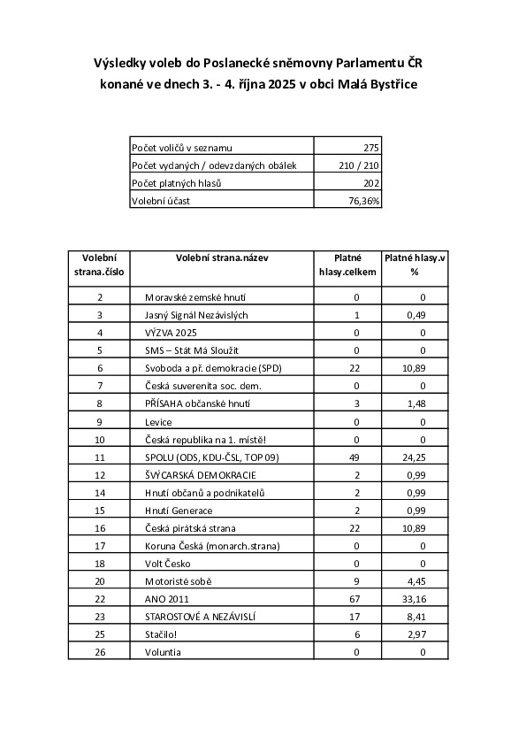 • Výsledky voleb v obci Malá Bystřice 04/10/2025