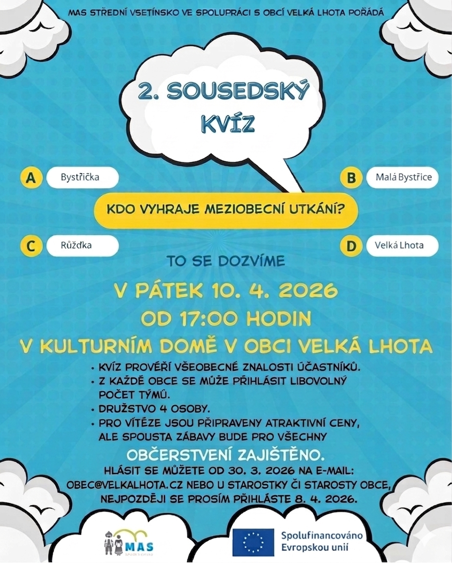Malá Bystřice > Archiv aktualit > Aktuality z obce > Sousedský kvíz na Velké Lhotě Sousedský kvíz na Velké Lhotě Rubriky Aktuality z obce Datum publikování 01/04/2026 Poslední aktualizace 01/04/2026 Autor Místostarostka obce V pátek 10. 4. 2026 se od 17 hodin uskuteční 2. kolo Sousedského kvízu, tentokrát na Velké Lhotě. Čtyřčlenné týmy se mohou přihlásit do 8. 4. 2026 na mail: obec@velkalhota.cz Vrátit se na hlavní navigaci
